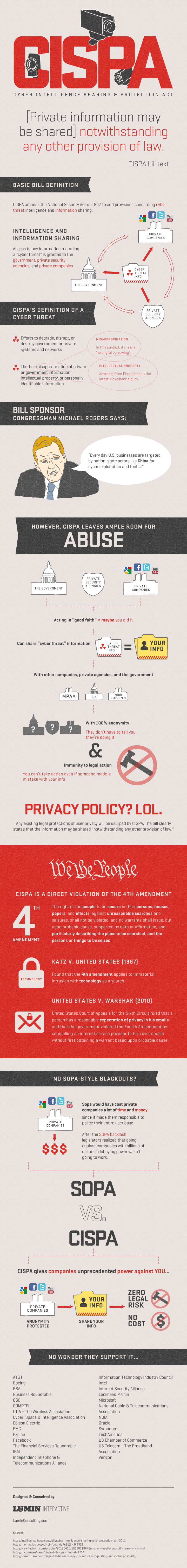 “I just learned that CISPA (the Cyber Intelligence Sharing and Protection Act) will be reintroduced next week. In its previous form, the bill would have given federal agencies unlimited access to virtually any of my personal data and online communication-- without a warrant. Our rights online are not negotiable. Please oppose any bill that would let companies share my personal information with the government.”